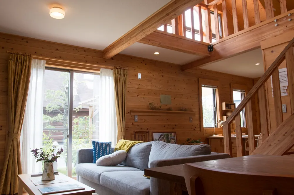 落ち着いた色合いの壁紙と、木のぬくもりを随所に感じられる天然温泉付きの貸別荘です。