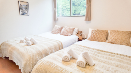 各寝室には快適な寝具を備え、グループやファミリーでの滞在にも対応。