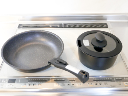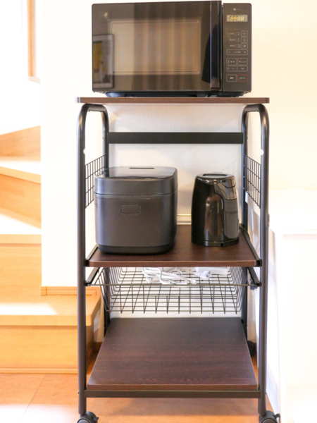 キッチンには冷蔵庫、電子レンジ、コンロなどの調理家電が揃っており、自炊や簡単な食事の準備にも便利です。