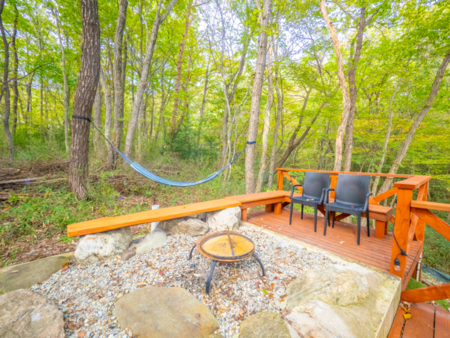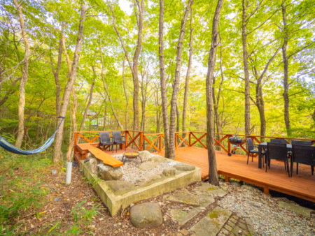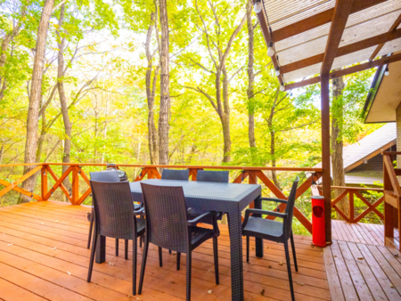 広いウッドデッキで心ゆくまで過ごす贅沢なひととき。焚火の温もり、川のせせらぎ、遥かに広がる空。