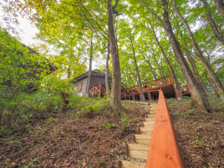 朝露に濡れた緑の草原は、太陽の光を受けて静かに輝き、遠くの山並みを黄金色の光がやさしく包みます。夏には涼やかな高原の風が、木漏れ日とともにウッドデッキを吹き抜け、家族や仲間が集うテーブルには、笑顔と美味しいBBQの香りが広がります。