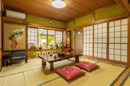 最低の宿泊施設です。まず、貸別荘では無く普段、家主が生活している場所を提供していると思われる。部屋の清掃は、されていない。ホコリと動物毛が絨毯にこびりついた。設備備品についても、記載されている物は殆どなく、ホットプレートは、油ホコリでベタベタ、食器は、小皿程度でそれもベタベタ。冷蔵庫の中は、色々な物が入れてある状態。布団、縁側?に積み上げてあり、シーツなどクリーニングされてない、シミだらけ。