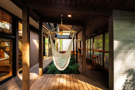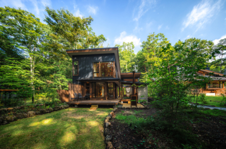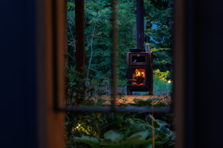 吹抜け一面の窓からナラ林をのぞむ、木漏れ日があふれる室内。温もりのある空間で過ごす素朴な時間。季節のうつろい、一日の時間のうつろいを楽しむヴィラ。