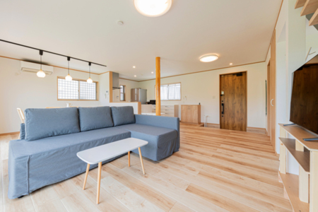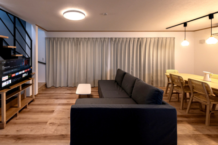 テレビはNetflix等の動画視聴にも対応。大きめのソファに座ってゆったりとお楽しみ頂けます。