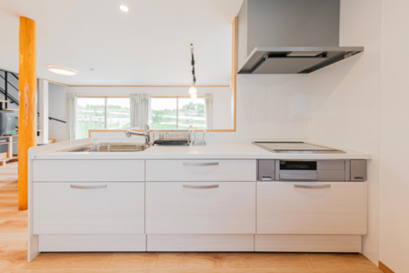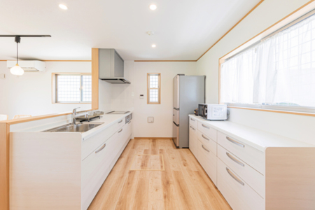 LDK:広々とした空間で、お食事やテレビ、動画視聴を楽しめます。キッチンも広く、2人以上での調理も可能です。ウッドデッキに面しています。