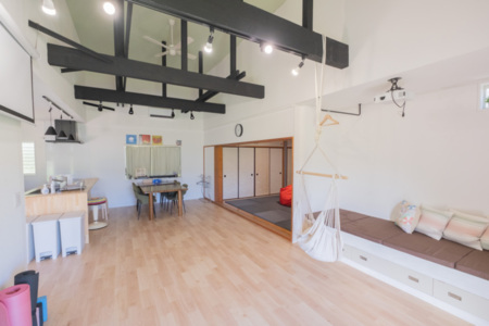 ○本施設は1棟貸別荘です。開放感あふれる高い天井のリビング。ご家蔵・ご友人とゆったりとした時間をお過ごしいただけます。