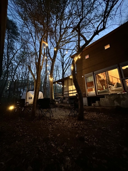 ✓壁一面の150インチ大型スクリーンと本格プロジェクター、音響設備で森の中でホームシアターを楽しめる!