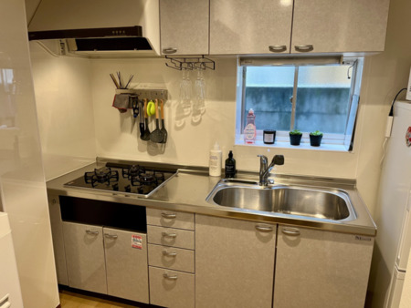 ・冷蔵庫、電子レンジ、炊飯器、コンロ、食器類などを備えた設備の整ったキッチン