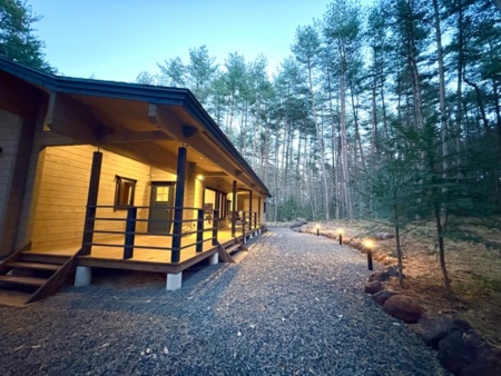 12月20日(土)OPEN!!浅間山麓に広がる静かな針葉樹の森に佇む、大人の隠れ家のようなモダンログハウス。木の香りと温もりに包まれて、心も体もゆったりとお寛ぎいただくことができます。
