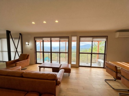 室内は木の温もりを感じる落ち着いたインテリア。広めのリビングと複数の寝室を備え、ご家族連れでもゆっくり過ごせます。夜は業務用カラオケ(第一興商製)で盛り上がって下さい。Wi-Fi完備、駐車スぺ―スあり、冷暖房設備も充実しており、四季を通じて快適に滞在できます。