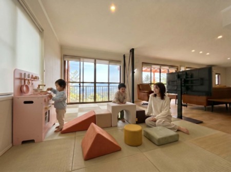 標高約800メートル、那須高原の高台に位置する静かな別荘。晴れた日には関東平野を一望し、遠くに筑波山まで見渡せます。運が良ければ、早朝に幻想的な雲海や朝霧に包まれる瞬間も。自然の美しさを家族みんなで満喫できる最高のロケーションです。