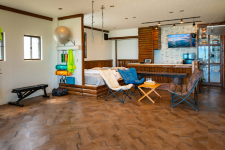 エアリアルヨガやピラティス、ダンス、ストレッチ、吊り輪、軽度の筋力トレーニングなど、身体を心地よく動かせる空間を確保するため、あえて生活スペースをコンパクトに設計しています。