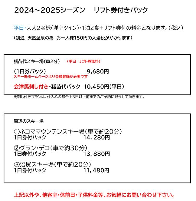 周辺スキー場のリフト券を扱っております。お気軽にお問い合わせください。 (子供券・マスター券・時間券等)