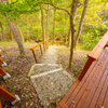 森の中に佇む静かなログハウス。変わりゆく空の色や鳥のさえずり、虫の声、風のそよぎを楽しめるウッドデッキを備えています。隣には広々とした庭があり、ブランコやハンモックもご用意。