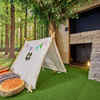 リビングにはお子様向けのやぐらでジャングルジム。デッキでのバーベキュー体験。100インチのホームシアターで没入感抜群!